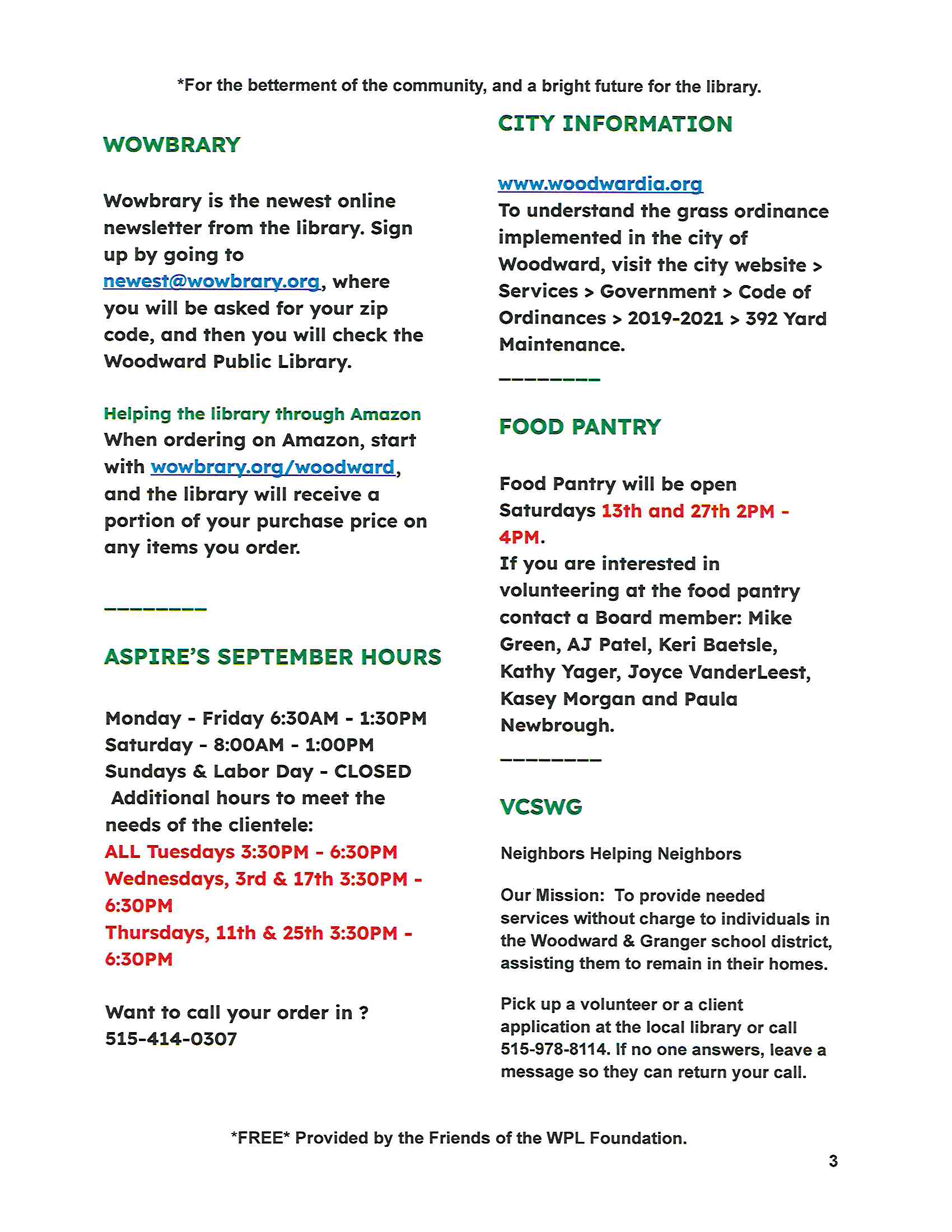 Open  M-W-F until 5 pm; Tuesday & Thursday until 7 pm; Saturday 9am - 12 noon & Closed Sunday.